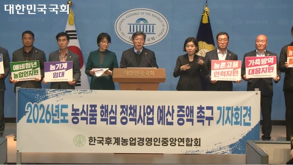 한국후계농업경영인중앙연합회(이하 한농연)은 내년도 예산과 기금운용계획안 국회 심의를 앞둔 지난 3일 서울 여의도 국회 소통관에서 ‘2026 농식품 핵심 정책사업 예산 증액 촉구 기자회견’을 가졌다.