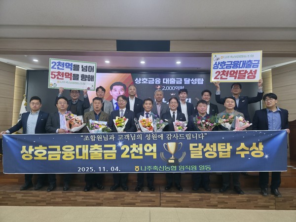 나주축협(조합장 나상필)이 상호금융대출금 2000억 원 달성이란 기념비적인 성과를 올리며 지난 4일 농협중앙회 전남 지역 본부에서 달성탑을 수여 받았다.