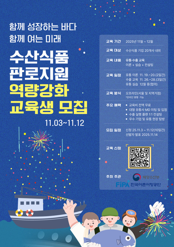 한국어촌어항공단(이사장 홍종욱)은 오는 18일까지 수산식품 기업을 대상으로 국내 수산식품 기업의 유통·수출 역량 강화를 위한 ‘2025년 수산식품 판로지원 역량 강화 교육’ 참가자를 모집한다고 6일 밝혔다.