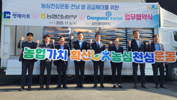 농협전남본부(본부장 이광일)는 ㈜동원F&B(대표이사 김성용), 펫메이트(주)(대표이사 양우석)와 함께 지난 6일 강진군농협쌀조합공동사업법인에서 ‘농심천심 운동’과 전남쌀 공급 확대추진을 위한 다자간 MOU를 체결했다.