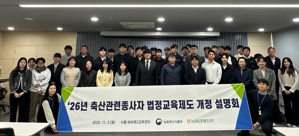 농협경제지주 축산경제와 농림축산식품부는 지난 3일 서울 서대문구 바비엥교육센터에서 축산관련종사자 교육 운영기관을 대상으로 ‘2026년 축산관련종사자 법정교육제도 개정 설명회’를 개최했다.