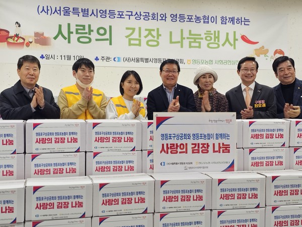 서울 영등포농협 사회공헌실천재단(이사장 백호)은 지난 10일 영등포구상공회(회장 김동환)와 함께 겨울철을 앞두고 지역 내 어려운 이웃들에게 따뜻한 온정을 전하는 ‘사랑의 김장 나눔행사’를 가졌다.