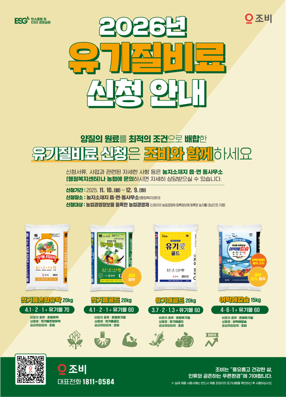 지난 10일부터 전국에서 ‘2026년도 유기질비료 지원사업’ 신청 접수가 일제히 시작됨에 따라 ㈜조비가 자사의 고품질 유기질비료 4종을 적극 추천했다.