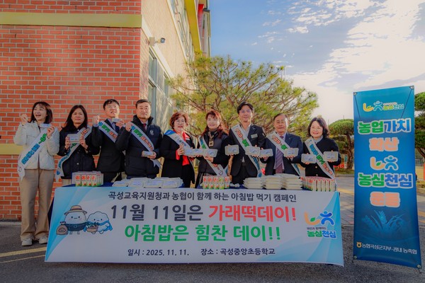 농협곡성군지부(지부장 방현용)는 지난 11일 농업인의 날을 기념해 곡성교육지원청(교육장 심치숙), 곡성농협(조합장 김완술)과 함께 곡성중앙초등학교 정문에서 가래떡데이와 아침밥 먹기 캠페인을 전개했다고 밝혔다.