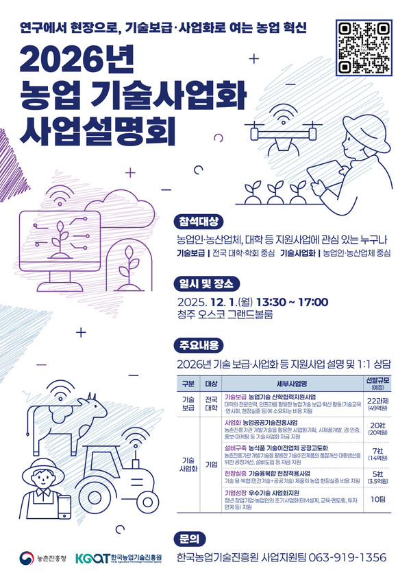 한국농업기술진흥원은 농산업 분야 연구 성과의 현장 확산과 사업화 촉진을 위해 12월 1일, '2026년 농업 기술사업화 사업설명회(이하 사업설명회)'를 개최한다고 밝혔다.