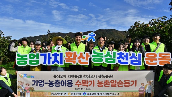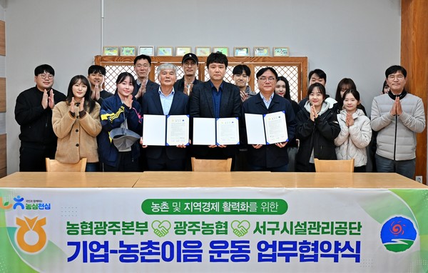 농협광주본부(본부장 이현호)는 지난 11일 광주 북구 무등산 평촌마을에서 광주농협(조합장 김순택), 서구시설관리공단(이사장 직무대행 정창욱)과 함께 ‘기업-농촌이음 운동’ 업무협약을 체결했다고 밝혔다.