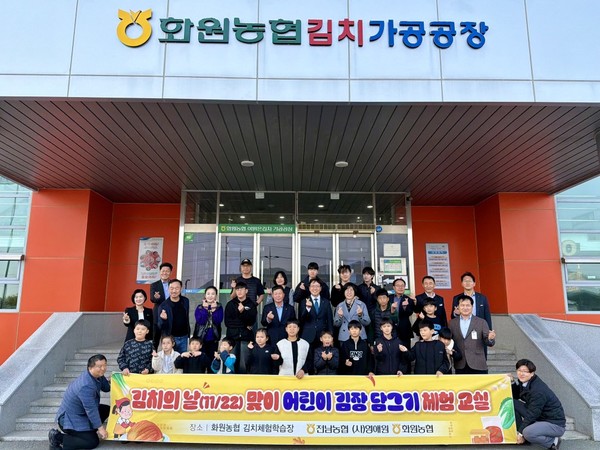 농협전남본부(본부장 이광일)는 화원농협(조합장 김복철) 김치체험학습장에서 김치의 날(11월 22일)을 기념하고 농산물 소비촉진을 통한 ‘농심천심 운동’ 확산을 위해 ‘어린이 김장 담그기 체험교실’을 진행했다.
