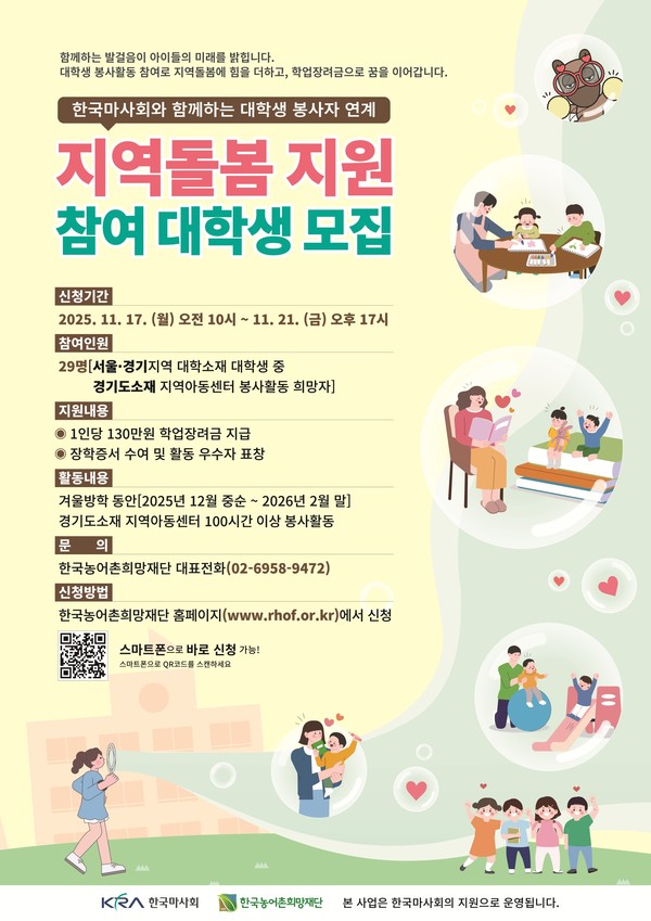 박상희 농어촌희망재단 이사장은 “지역사회의 실질적 돌봄 수요를 대학생의 역량으로 연결하는 의미 있는 사업”이라며 “공익적 가치 실현과 청년의 성장을 동시에 도모하는 좋은 기회가 될 것”이라고 밝혔다.