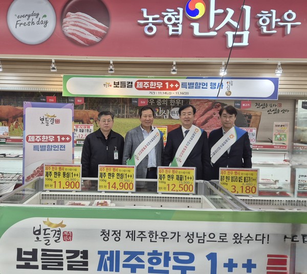 농협경제지주 축산경제는 지난 14일 하나로유통 성남유통센터에서 안병우 축산경제 대표이사, 천창수 제주축협 조합장, 윤용섭 축산물도매분사장, 민선홍 성남유통센터 지사장 등이 참석한 가운데 ‘보들결 제주한우 1++ 특별 할인행사’를 실시했다.