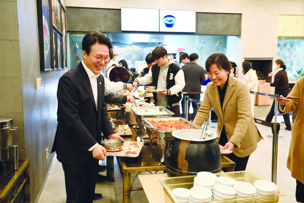 김민석 국무총리는 지난 17일 성균관대 600주년기념관 은행골식당을 방문, 학생들과 ‘천원의 아침밥’을 함께하며 소통의 시간을 가졌다. 정부는 올해 97억2700만 원을 투입해 전국 208개 대학에 469만 식을 지원하는 것을 목표로 천원의 아침밥 사업을 추진하고 있다. 사진은 김 총리(왼쪽)와 송미령 농림축산식품부 장관이 대학생들과 천원의 아침밥을 담고 있는 모습. [농림축산식품부 제공]