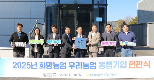 NH농협은행 경기본부는 18일 ㈜농업회사법인 샘미트코리아(대표이사 박종필)를 '희망농업 우리농가 동행기업'으로 선정하고 화성시 정남면 소재 본사를 찾아 현판식을 갖고 소통하는 시간을 가졌다.