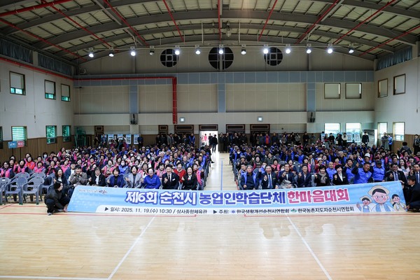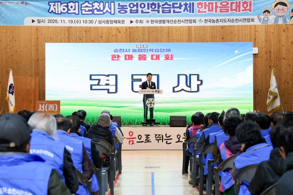 순천시(시장 노관규)는 지난 19일 상사종합체육관에서 ‘제6회 순천시 농업인 학습단체 생활개선회농촌지도자회 한마음대회’가 농업인 등 300여 명이 참여한 가운데 성황리에 열렸다고 밝혔다.