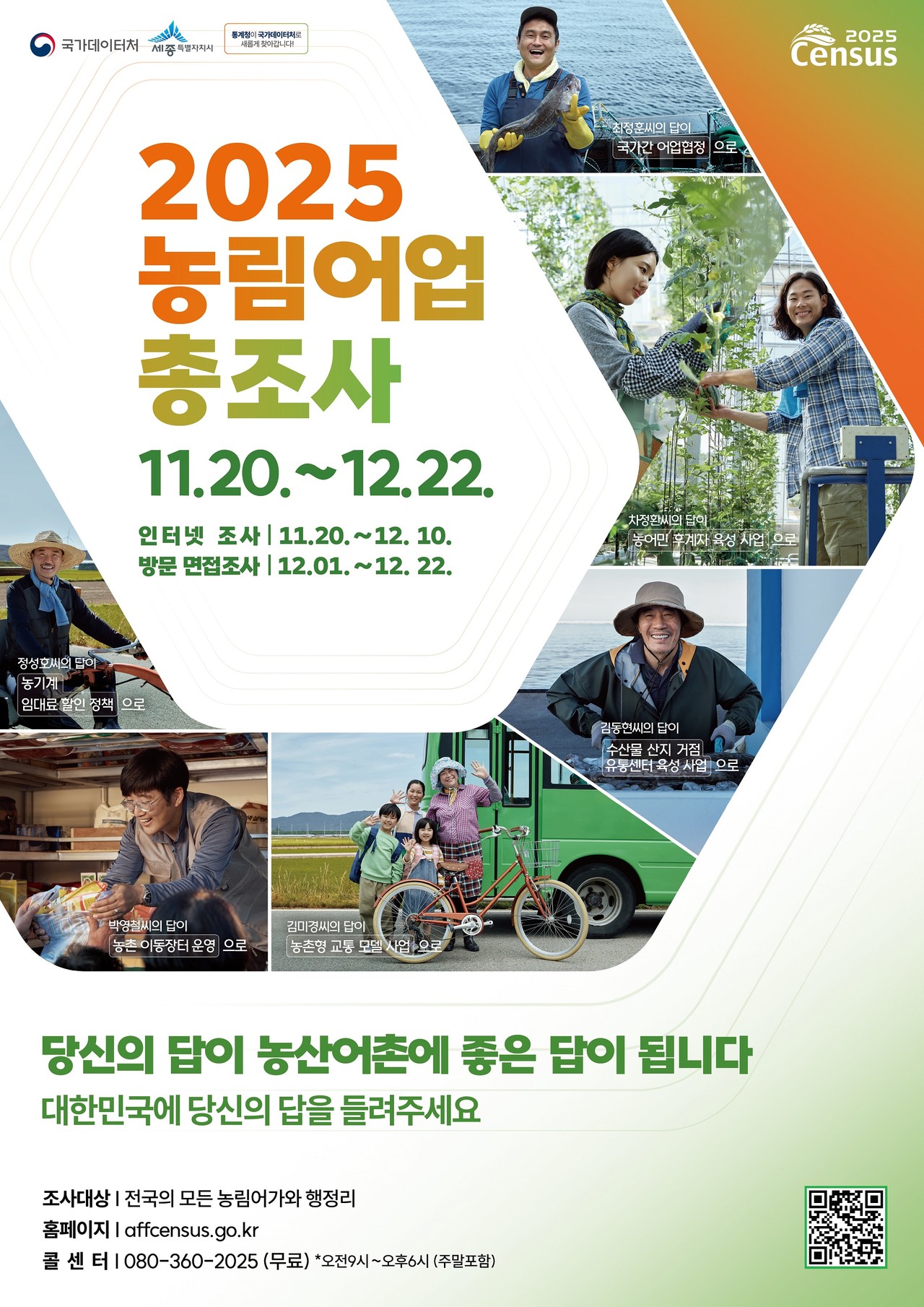 먼저 세종시는 20일부터 다음달 22일까지 ‘2025 농림어업총조사’를 실시한다.