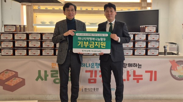 한식진흥원(이사장 이규민)은 최근 하나은행(은행장 이호성)과 ‘2025년 김장 나눔 봉사활동’을 실시하고 완성한 김장김치를 지역사회 취약계층에 전달할 예정이라고 지난 19일 밝혔다.