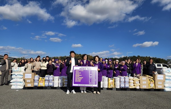 신안군에 따르면 지난 21일 신안군공설운동장에서 신안군여성단체협의회 회원과 관내 사회복지시설 종사자 등 100여 명이 참석한 가운데 ‘2025 사랑의 김장재료 후원 물품 전달식’을 진행했다.