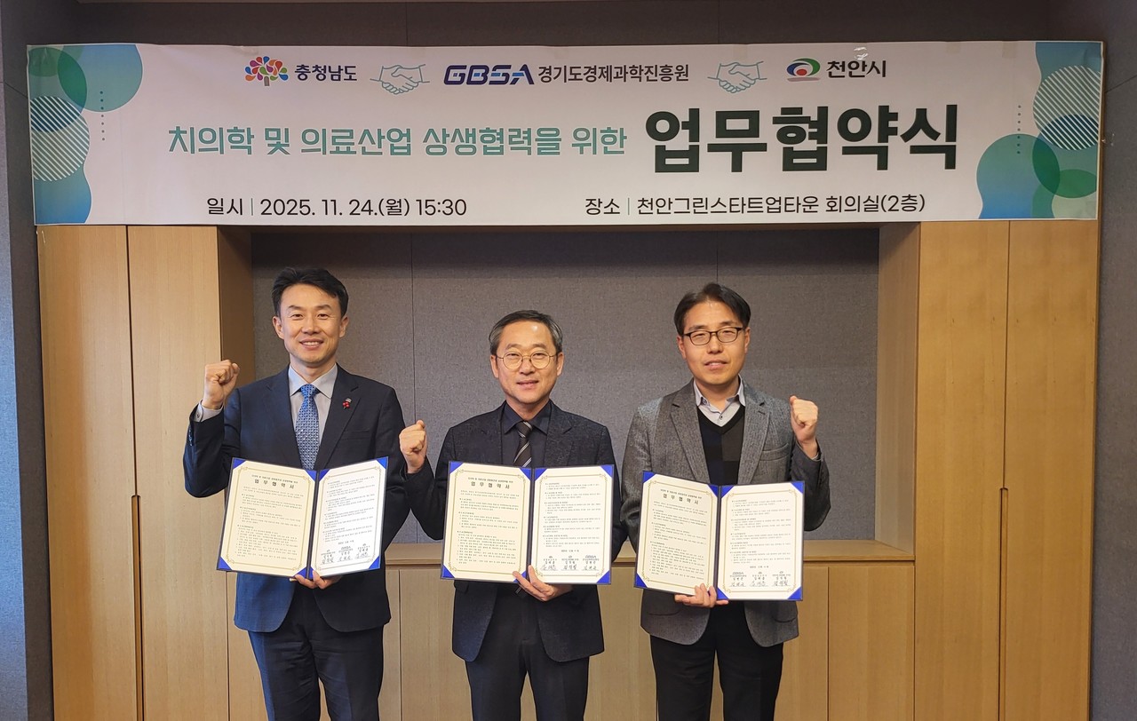 천안시가 충청남도, 경기도경제과학진흥원(GBSA)과 치의학·바이오 산업의 전주기 협력체계 구축을 위한 업무협약을 체결했다.