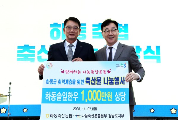 하동축협(조합장 김구영, 사진·왼쪽)은 최근 열린 ‘하동별맛축제’를 기념해 하동솔잎한우(120박스, 1000만 원 상당)를 기탁했다.