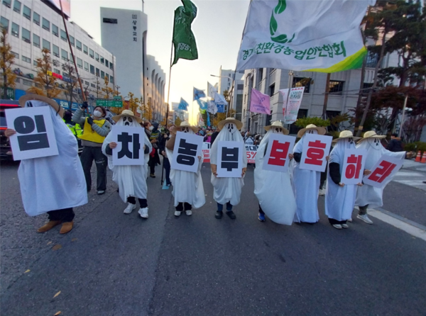 숭례문 앞에 모인 친환경 생산자들이 임차농 피해 대책 마련을 촉구하고 나섰다.