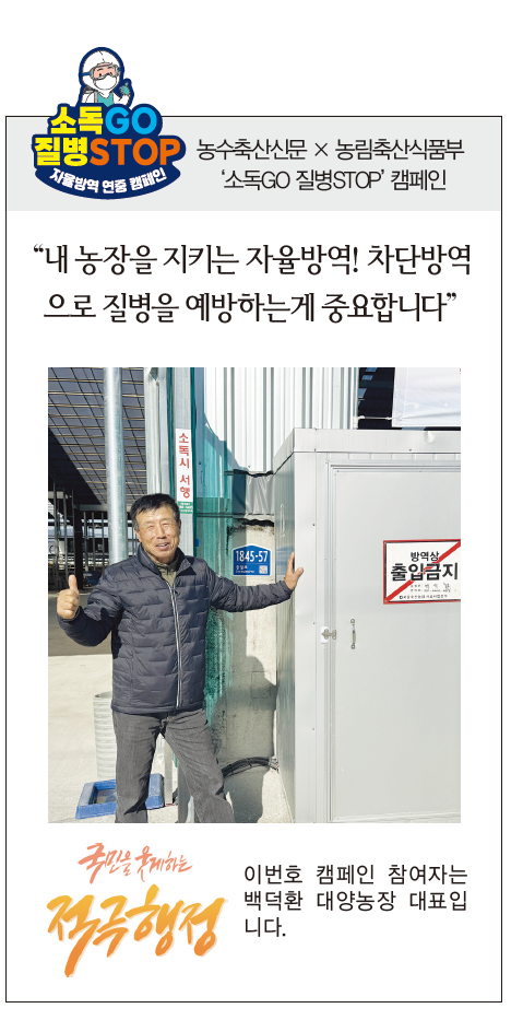 [농수축산신문=농수축산신문] 이번호 캠페인 참여자는 백덕환 대양농장 대표입니다. 농수축산신문 webmaster@aflnews.co.kr 다른기사 보기 저작권자 © 농수축산신문 무단전재, 재배포 및 AI학습 이용 금지 당신만 안 본 뉴스 [AFL칼럼] ASF 백신 개발, ‘K-방역’의 새 지평 열까 서울 영등포농협 사회공헌실천재단, '가정의 달 이벤트' 경품 증정식 개최 예산군, ‘힐링·건강·나눔’으로 주민 삶의 질 높인다 영등포농협 사회공헌실천재단, 동작구 '사랑의 온도탑' 제막식 '1호 주자'로 나서 지역사회 온기 확산 물꼬 터 차기 농협 축산경제 대표이사 선거 3파전 영농형태양광, 임차농 보호장치 마련을…정부, 투기 방지법 ‘밑그림’ [Issue+] 2026 국제곡물시장 전망 [AFL칼럼] ASF 백신 개발, ‘K-방역’의 새 지평 열까 댓글삭제 삭제한 댓글은 다시 복구할 수 없습니다. 그래도 삭제하시겠습니까? 비밀번호 닫기 기사 댓글 0 댓글 접기 로그인 후 이용 가능합니다. 댓글 내용입력 비회원 로그인 이름 비밀번호 댓글 내용입력 댓글쓰기 계정을 선택하시면 로그인·계정인증을 통해 댓글을 남기실 수 있습니다. 회원 로그인 비회원 글쓰기 이름 비밀번호 자동등록방지 로그인 옵션 창닫기 주요기사 숭례문 앞에 모인 ‘유령농부’들…유기농업 2배 확대 결의 플랜티팜, 사우디 성지 메디나에 K-스마트팜 구축한다 산림경영지도 우수사례 최우수상에 이이섭 상주시산림조합 지도원 세포배양 인조축산물, 안전성 문제 여전히 화두 [Issue+] 지속가능한 농업은 우리의 사명...ESG 경영 발굴·확산 ‘주목’ [농수축산신문-수협중앙회 공동기획] 착용海요 구명조끼 안전海요 우리바다 ⑦ 제주시 이보라 조일호 선장