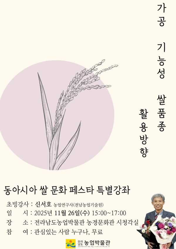 전남도농업박물관(관장 김옥경)은 26일 ‘동아시아 쌀 문화 페스타’ 다섯 번째 특별강좌를 열어 국내 대표 쌀 품종 개발 전문가를 초청해 미래 쌀 산업의 혁신 모델을 제시했다고 밝혔다.