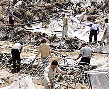 태풍 `메기''가 강원·영호남지방을 강타해 농작물 침수 2만2564ha, 농경지 유실·매몰 74ha, 수리시설파손 77개소, 가축폐사 26만7000마리 등의 피해가 발생했다. 사진은 지난 20일 전남 나주시 남평읍의 폐허로 변한 배추비닐하우스에서 나주시청 직원들이 복구작업을 펼치고 있는 모습.