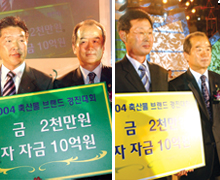 2004 축산물브랜드 경진대회에서 최고 축산물브랜드로 ''대관령한우''와 ''크린포크''가 각각 선정돼 국무총리상과 농림부장관상을 각각 수상했다. 사진은 허상만 농림부장관과 한우부문 대상을 받은 평창영월정선축협의 이석래 조합장<왼쪽 사진>, 허 장관과 돼지부분 대상을 받은 (주)선진의 류태호 식육유통사업 대표이사<오른쪽 사진>가 시상식후 기념촬영을 한 모습.