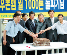 목우촌 햄 월 매출 1000톤 돌파는 노사가 합심해 이뤘다는 점에 의의를 두면서 오른쪽 2번째부터 고영곤 상무, 명의식 노조위원장, 송석우 축산경제대표, 고윤홍 분사장, 이정호 상무가 떡 절단식을 갖고 있다.