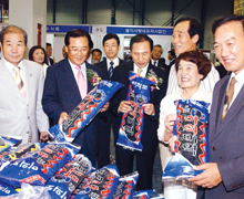 서울시와 전라남도는 추석을 맞아 지난 13일부터 16일까지 서울 강남구 대치동 소재 서울무역전시장에서 ''한가위 맞이 친환경 전남 농수특산물 직거래장터'' 를 개장했다. 사진은 박준영 전라남도지사(가운데 왼쪽)와 이명박 서울시장(가운데 오른쪽), 박계동 의원(맨 오른쪽)이 전시장을 둘러보고 있는 모습.