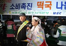 ▲ *농협광주본부 떡국 나눔행사 농협광주지역본부(본부장 정찬인)는 지난 1일 오전 7시 무등산 증심사 입구에서 새해 해돋이를 보러온 시민 2006명에게 무료로 ‘떡국’ 나눔행사를 개최했다. 이날 ‘떡국’나눔행사는 광주MBC(특별방송)와 공동으로 진행돼 올해 쌀 국회비준 통과로 수입쌀의 시중판매가 기정 사실화되는 가운데 어려움에 처한 우리농업 농촌에 대한 범시민적 우리쌀 사랑운동 동참과 갈수록 줄어든 쌀 소비확대를 위해 마련됐다.