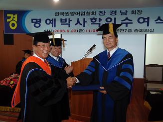 이날 학위 수여식에서 목연수 부경대학교 총장은 “우리 대학교에서는 여러 차례의 명예박사 학위 수여가 있었지만 장회장은 누구보다도 학위 분야에 전문지식은 물론이거니와 행정을 비롯한 다양한 현장의 체험을 지녀 이론과 실제 모두를 겸비한 탁월한 수산 전문가”라고 치하했다.