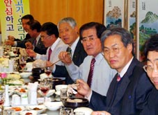 △닭고기 시식을 하고 있는 축산발전협의회 조합장들.