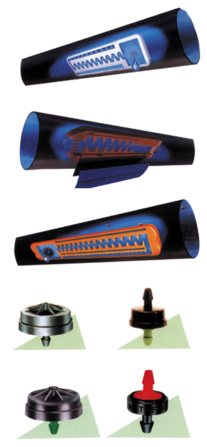 P.C. 및 P.C.J.등 타입이 소개되고 있는데 이중 P.C.는 점적기 간격을 원하는 대로 정할 수 있고, 압력보상 범위가 최고 40m까지 가능할 뿐만 아니라 경사도나 유입압력에 영향을 받지 않는다는 특징을 지니고 있다.