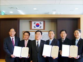 <사진 오른쪽부터 이정현 상무·고윤홍 축산물판매분사장·이승우 농협사료 사장·남 경우 대표·박종하 농협목우촌 사장·박치봉 상무>