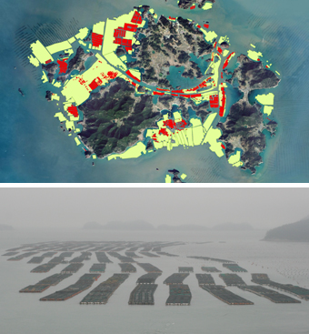 사진설명 : - 2010년 겨울 노화·소안·보길도(위에서부터 시계방향으로) 지역 항공사진. 붉게 표시된 지역이 전복가두리양식시설. 노란부분은 미역·다시마양식시설.