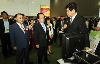 2012농식품수확후관리포럼 전시관에 방문한 서규용 농림수산식품부 장관(가운데)이 강창호 국립농업과학원 농업공학부장에게 ‘고춧가루 매운맛 측정시스템’에 대한 설명을 들으며 관심을 표명하고 있다.