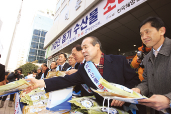 해양수산부와 전국해양산업총연합회는 지난 17일 서울 여의도 해운빌딩에서 ''어업인 돕기 수산물 소비촉진 행사''를 개최했다. 사진은 이종구 수협중앙회장(오른쪽에서 두번째)을 포함한 참석 내빈들이 전국해양산업총연합회 소비자들에게 건오징어와 미역을 나눠주고 있는 모습.
